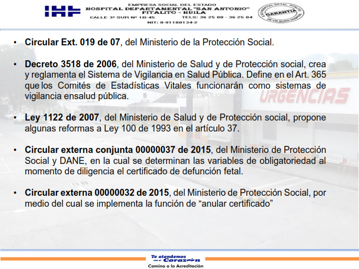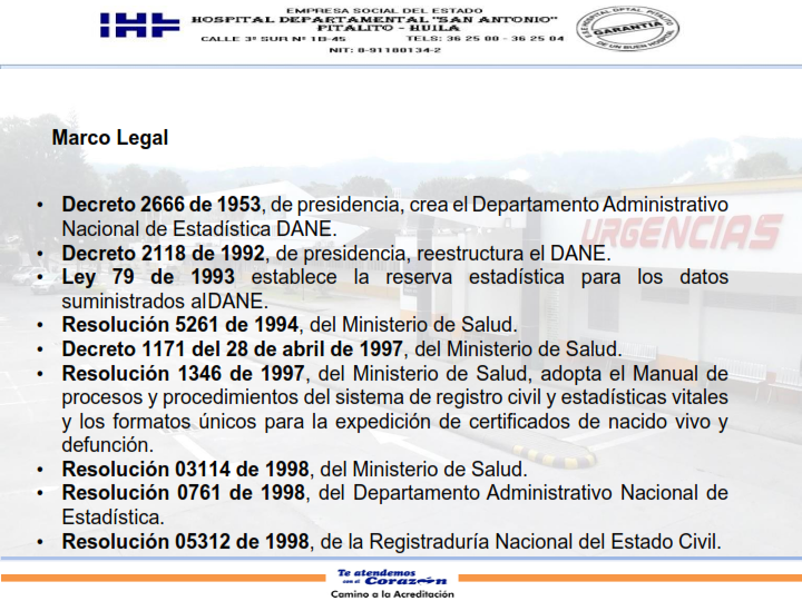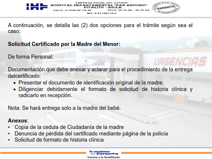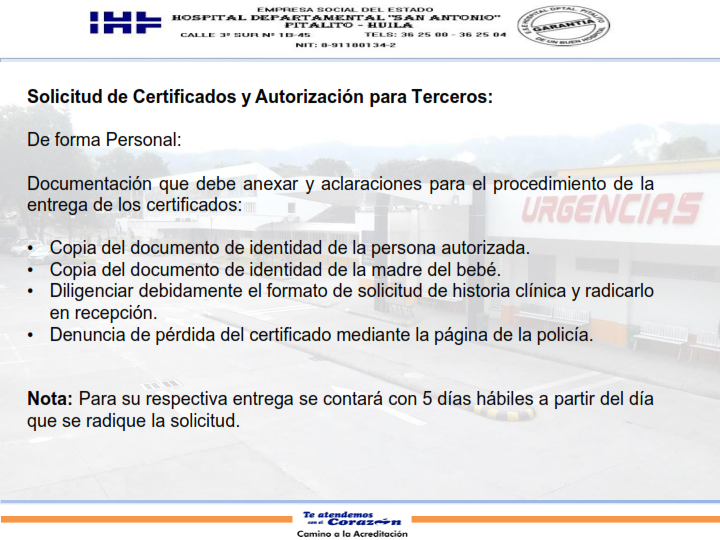 Certificado de nacido vivo y defunción 23 septiembre, 2025 - Por: Admin Hospital Pitalito Marco Legal Horario de entrega De Lunes a Viernes de 10:00 am a 12:00 pm y de 2:00 pm a 3:30 pm. Informes: Teléfono (098) 8362500. Ext 108