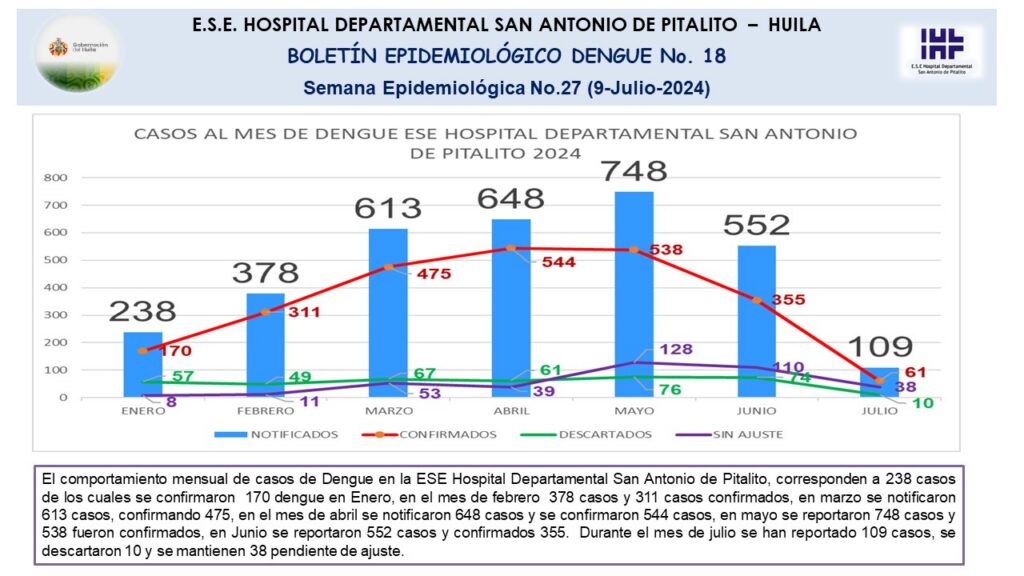 El Hospital Departamental San Antonio de Pitalito, presenta el Boletín Epidemiológico N.18, con el análisis de los casos de Dengue en la Semana epidemiológica SE 27 y el seguimiento a los casos mensuales reportados en el centro hospitalario, durante la presente vigencia.