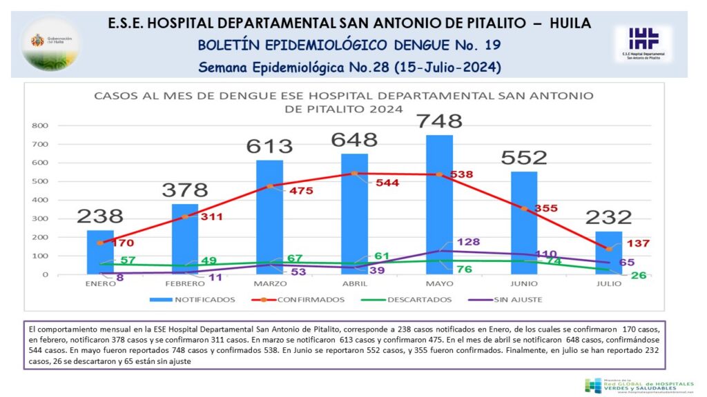 Como parte de las acciones de vigilancia y control al comportamiento de los casos de Dengue, el Hospital Departamental San Antonio de Pitalito, presenta el Boletín Epidemiológico N.19, con el análisis de los datos correspondientes a la Semana epidemiológica SE 28 y el seguimiento a los casos mensuales reportados en el centro hospitalario, durante la presente vigencia.