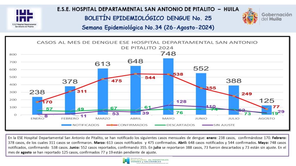 Desde el Hospital Departamental San Antonio de Pitalito, publicamos el Boletín Epidemiológico N.25, correspondiente a la Semana epidemiológica SE 34, en donde se presenta el comportamiento de los casos de dengue atendidos en el centro hospitalario.