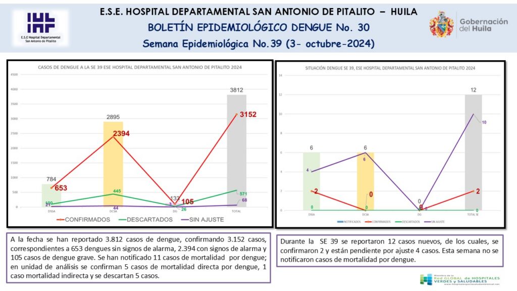 De acuerdo al análisis permanente, que se realiza desde la E.S.E. Hospital Departamental San Antonio de Pitalito, publicamos el Boletín Epidemiológico N.30, correspondiente a la Semana epidemiológica SE 39, para hacer seguimiento a los casos de dengue atendidos en el centro hospitalario.