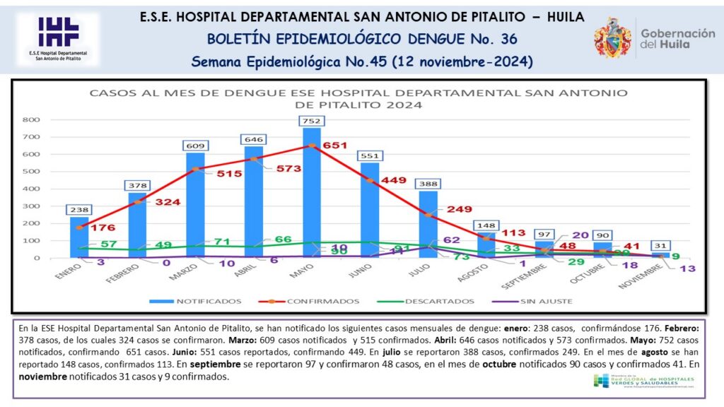 Desde la E.S.E. Hospital Departamental San Antonio de Pitalito, publicamos el Boletín Epidemiológico N.36, correspondiente a la Semana epidemiológica SE 45, para hacer seguimiento a los casos de dengue atendidos en el centro hospitalario.