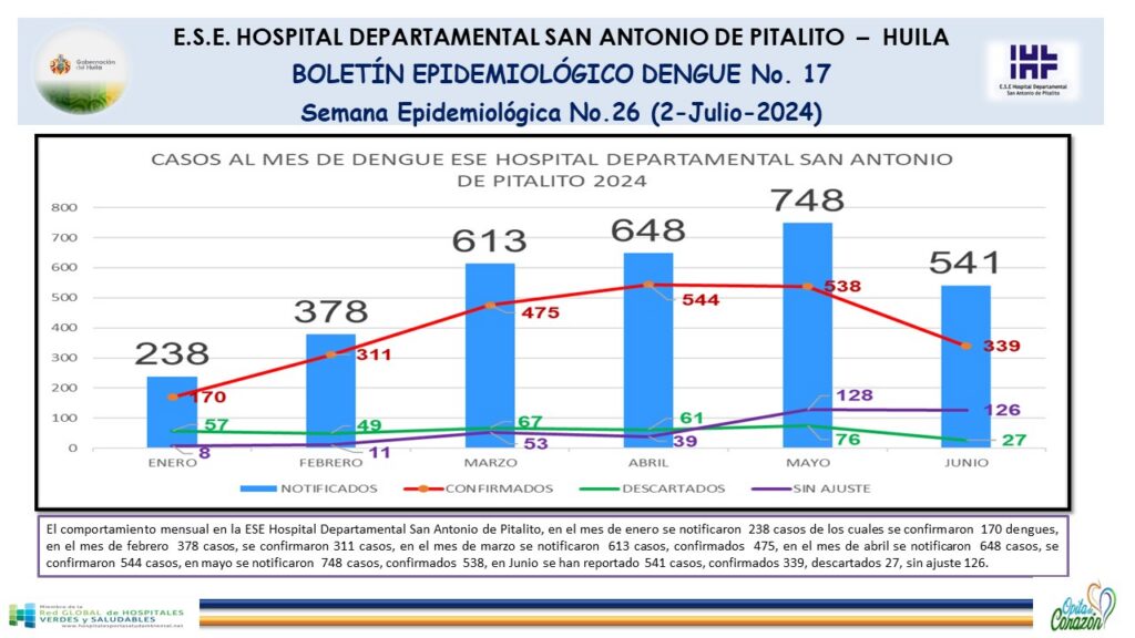 El Hospital Departamental San Antonio de Pitalito, presenta la situación de los casos de Dengue atendidos en el centro hospitalario, casos por mortalidad de Dengue y los que continúan en revisión en la Unidad de análisis, información correspondiente a la Semana Epidemiológica (SE) No.26.