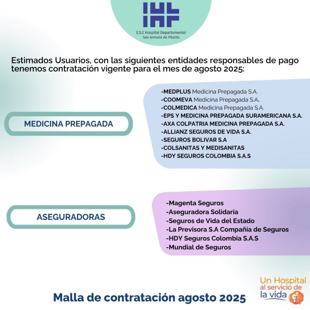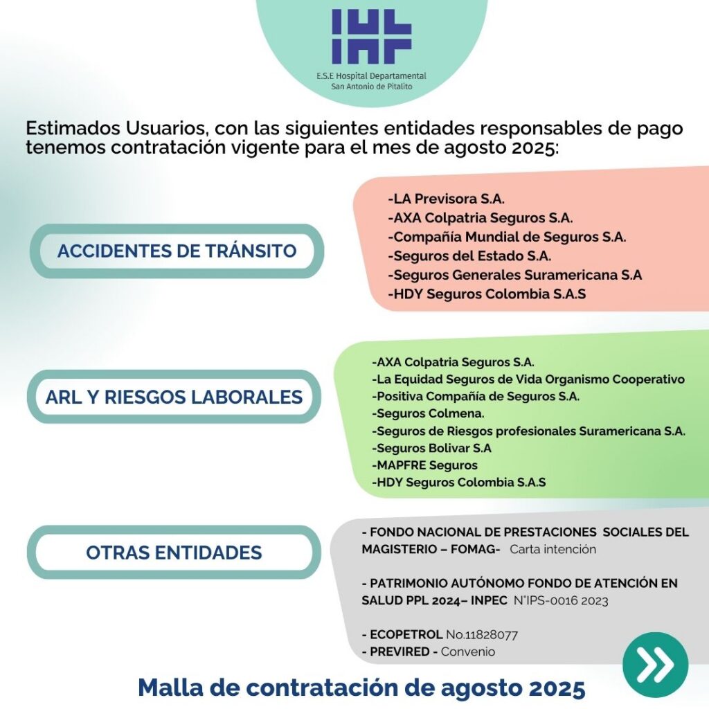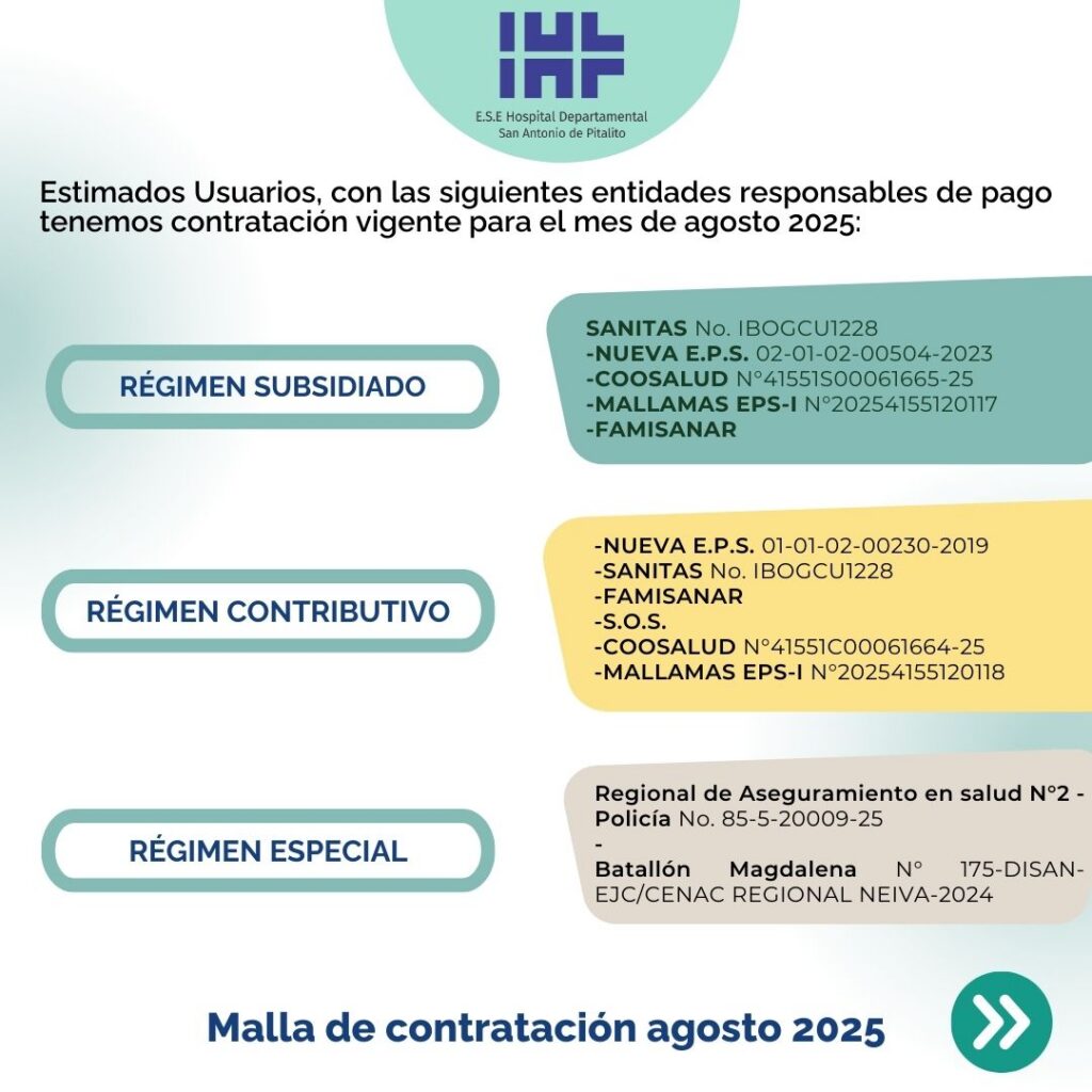 La E.S.E Hospital Departamental San Antonio de Pitalito, presenta la malla de contratación vigente en la institución, en las áreas de: régimen subsidiado, régimen contributivo, accidentes de tránsito, régimen especial, riesgos laborales, medicina prepagada, aseguradoras y otras entidades.