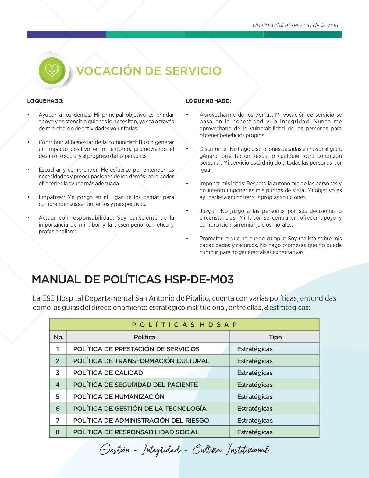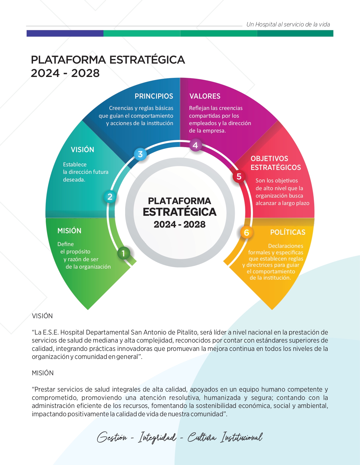 La E.S.E. Hospital Departamental San Antonio de Pitalito, será líder a nivel nacional en la prestación de servicios de salud de mediana y alta complejidad, reconocidos por contar con estándares superiores de calidad, integrando prácticas innovadoras que promuevan la mejora continua en todos los niveles de la organización y comunidad en general.