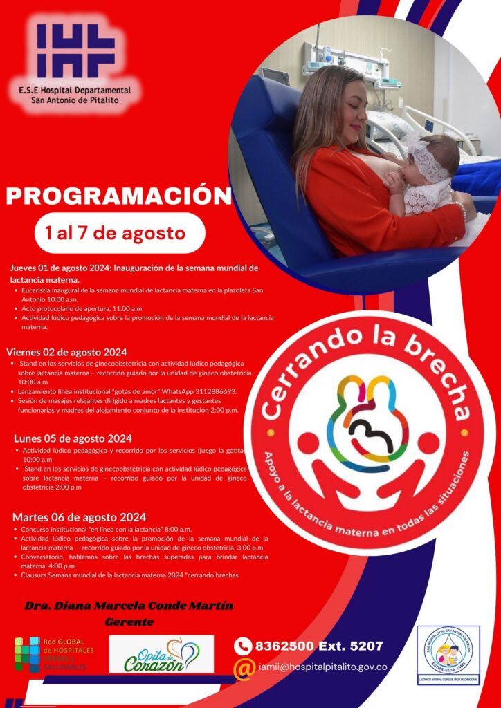 La programación desarrollará ferias, encuentros pedagógicos, talleres, el lanzamiento de la línea institucional “Gotas de amor”, conversatorios y concursos. La gerente del Hospital Departamental San Antonio de Pitalito, Dra. Diana Marcela Conde Martin, destacó y reafirmó el compromiso del centro hospitalario con la promoción de la Lactancia Materna, recordando la importancia de ella para los niños, niñas y las madres.